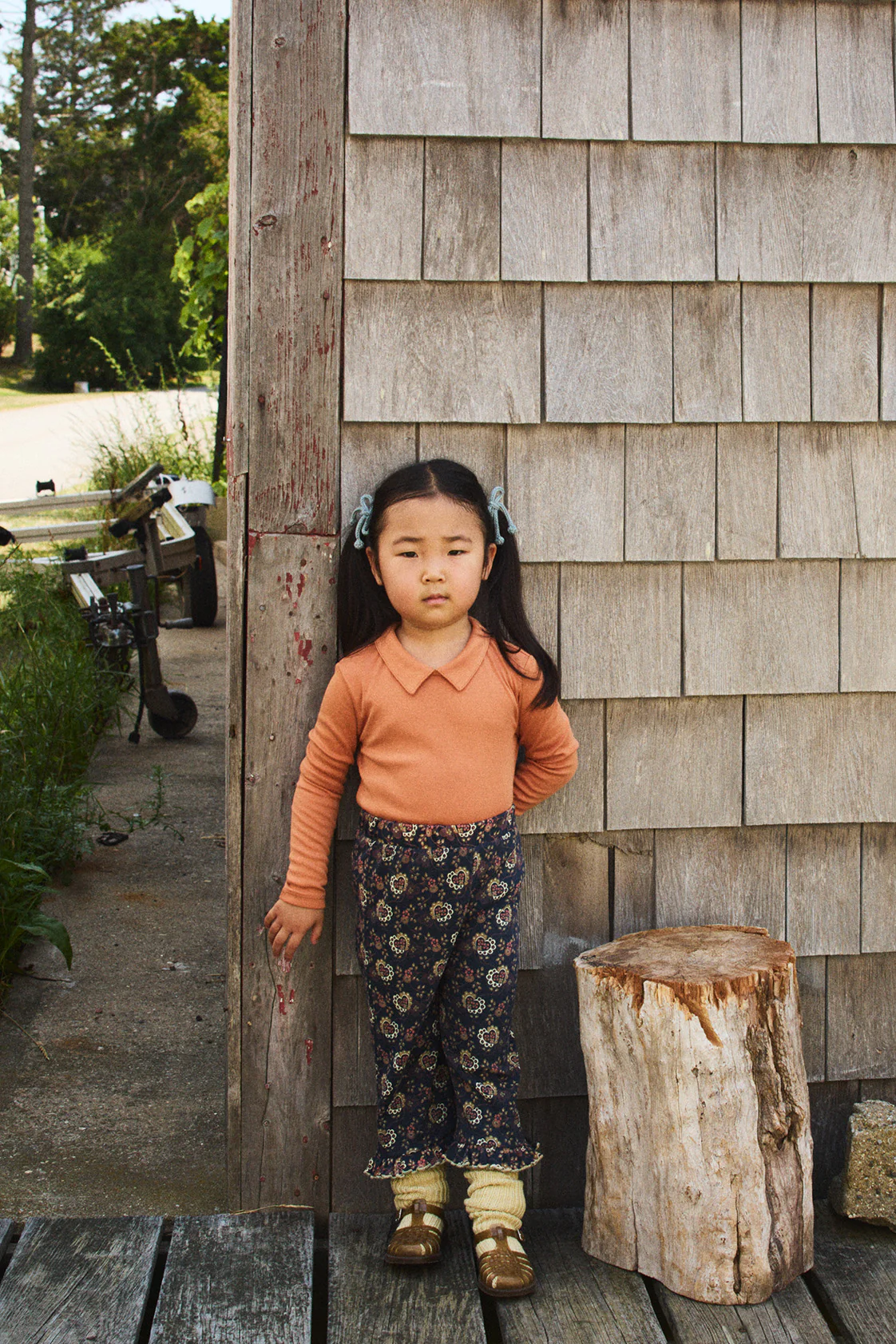 A roomy pull-on pant in organic Pima cotton, featuring a mid-calf length, gathered elastic waistband, and contrast merrowed edge ruffle hem.